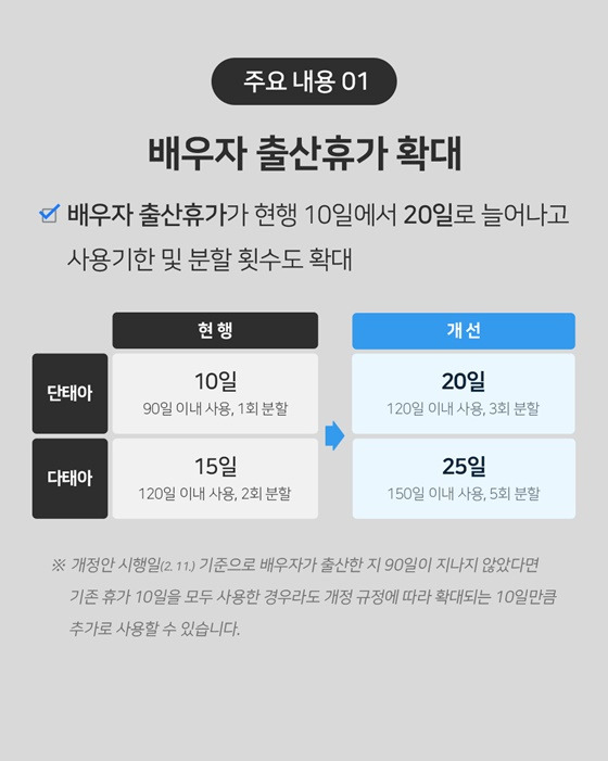 2025년 2월 23일부터 배우자 출산휴가가 다음과 같이 확대됩니다.