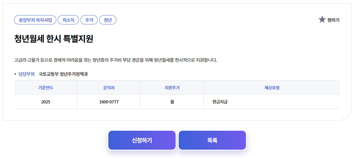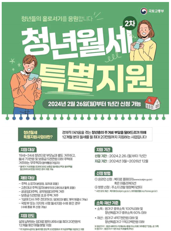 청년들의 주거비 부담을 덜어주기 위해 국토교통부에서 시행하는 한시적인 지원 정책으로, 소득이 일정 기준 이하인 청년들에게 월 최대 20만 원씩 최대 12개월간 지원하는 제도입니다. 기존의 청년 주거급여나 다른 복지제도와는 별도로 운영되며, 청년들이 보다 안정적인 주거 환경에서 생활할 수 있도록 돕는 역할을 합니다.